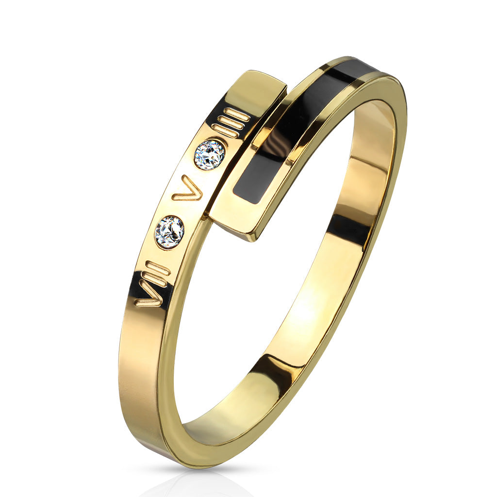 Stainless Steel Coiled Roman Numerals CZ Set Black Enamel Ends Gold Ring