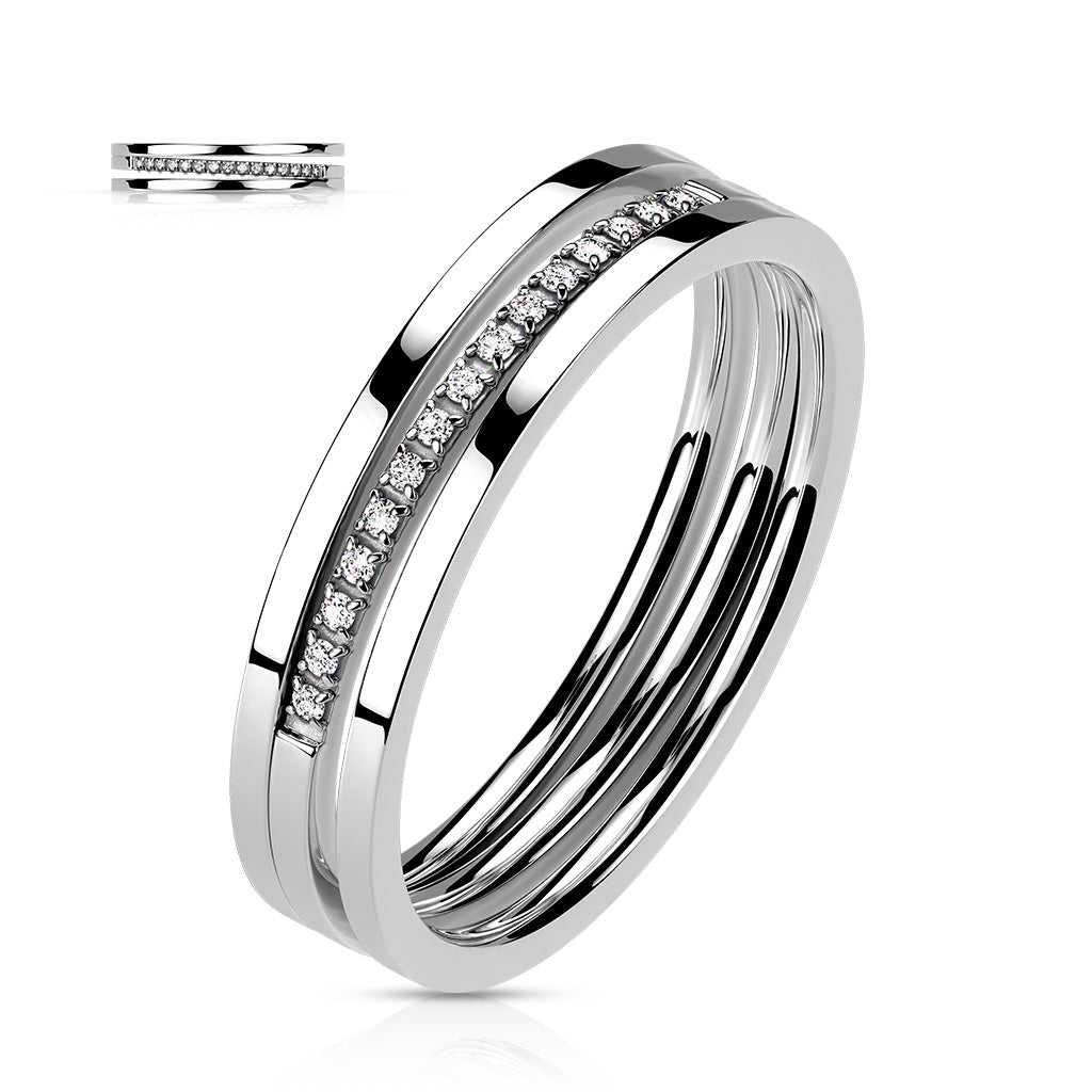 Stainless Steel Triple Line Middle CZ Pave Slant Ring